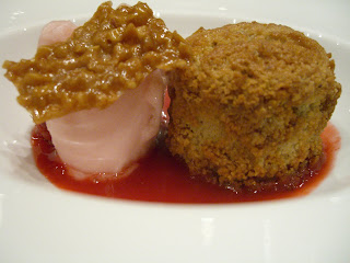 A new twist on an old classic. The parfait was deconstructed down to its separate elements and presented in an entirely different way. Chocolate sauce slathered across the plate and dusted in coconut with a scoop of coconut sorbet and coconut ice-cream topped with a thin wafer and surrounded with a chocolate foam.
